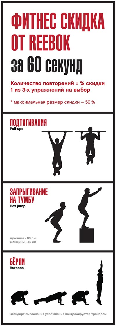 Кроме того, получить скидку в магазине и проверить себя можно будет, приняв участие в уже знакомой всем акции от #Reebok - "Скидка за 60 секунд"! (Максимальный размер скидки 50%, сумма покупки до оформления скидки не должна превышать 30 00 рублей)